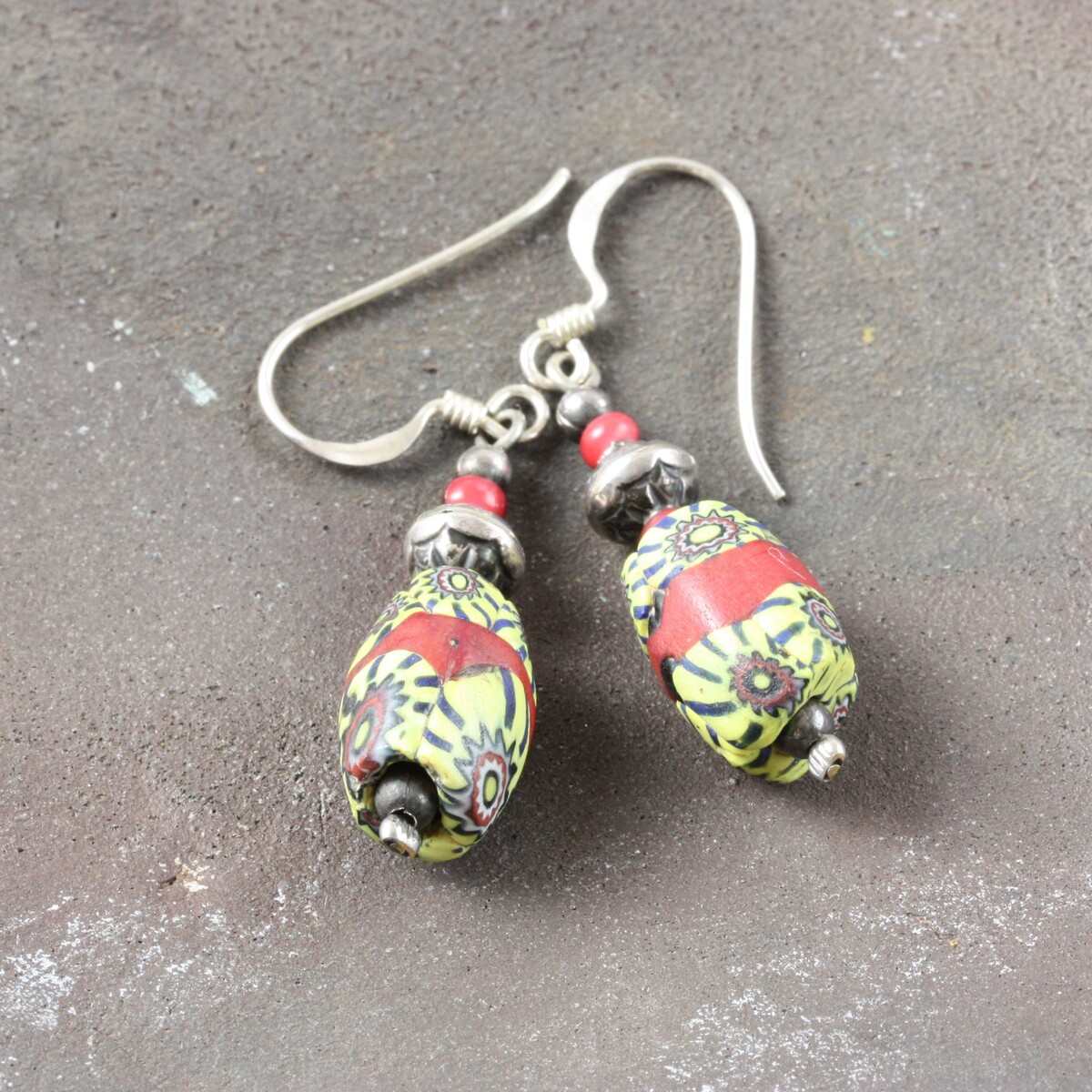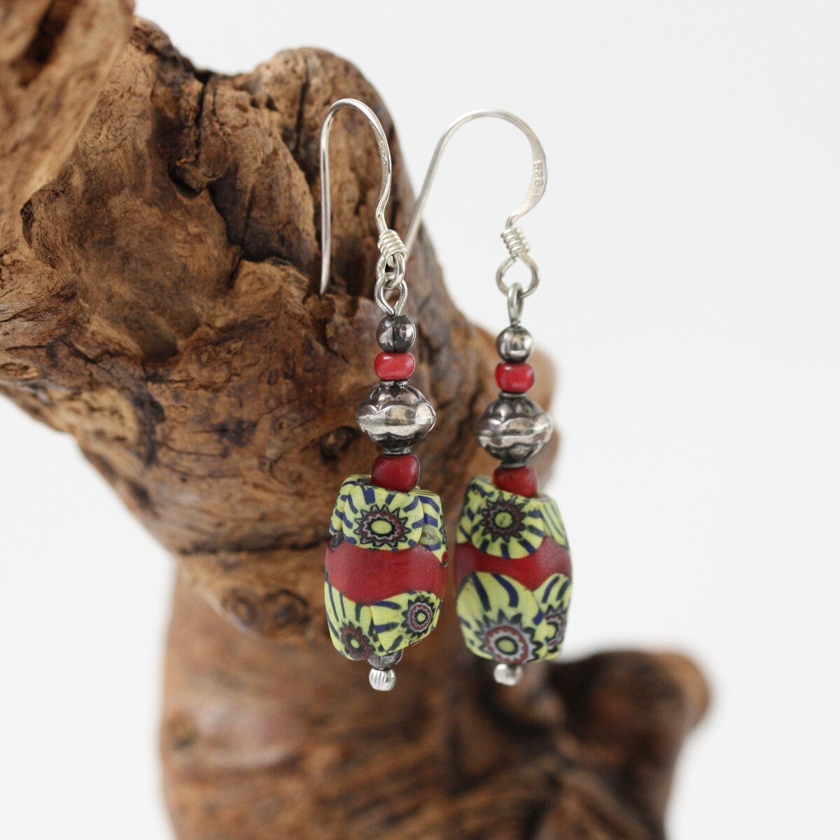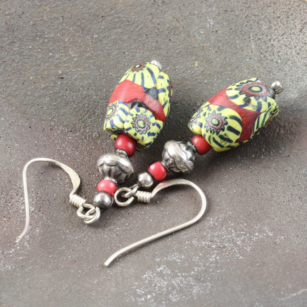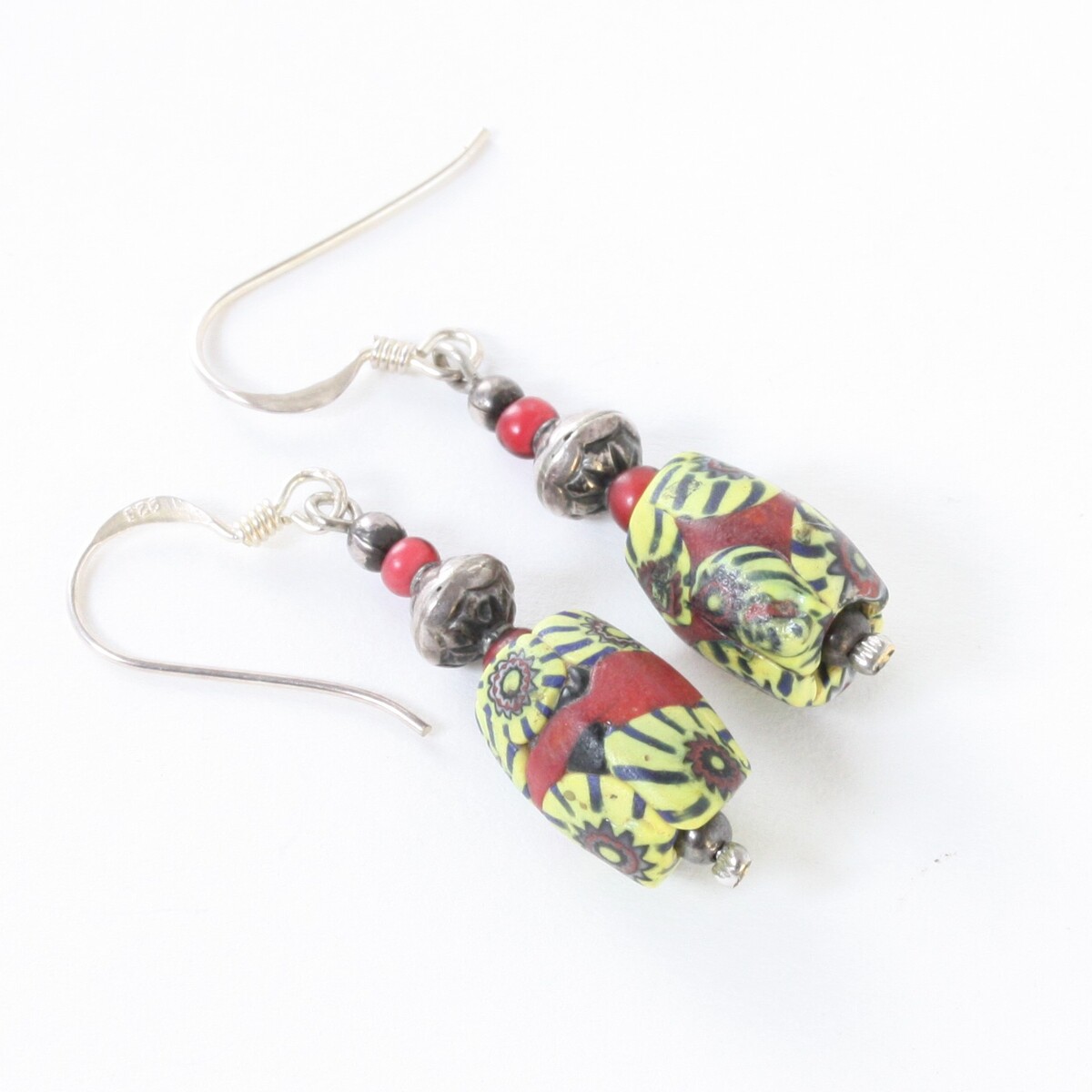 発色に銅を使った濃い赤(銅赤ガラス)と蛍光がかったイエローの6層シェブロンタイプのカンネのコントラストがエキゾチックなレアな玉です